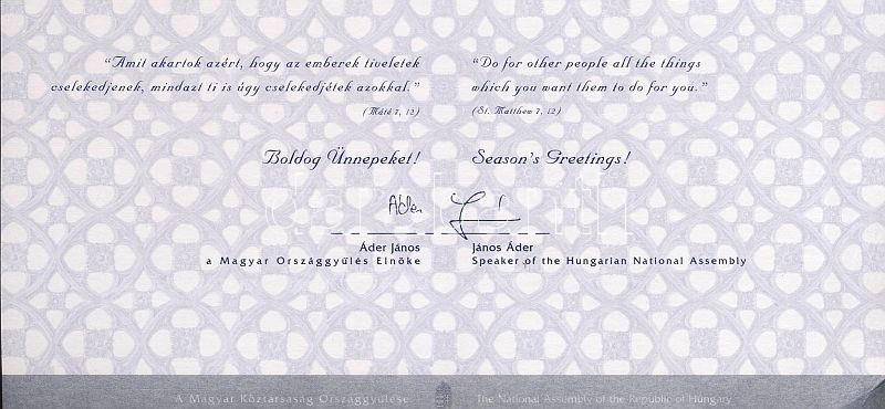 2000 Áder János házelnök aláírása üdvözlőlapon https://www.darabanth.com/de/82-Fernauktion/82.0/Andere-Sammelgebiete/~229/2000-Ader-Janos-hazelnok-alairasa-udvozlolapon~II173873