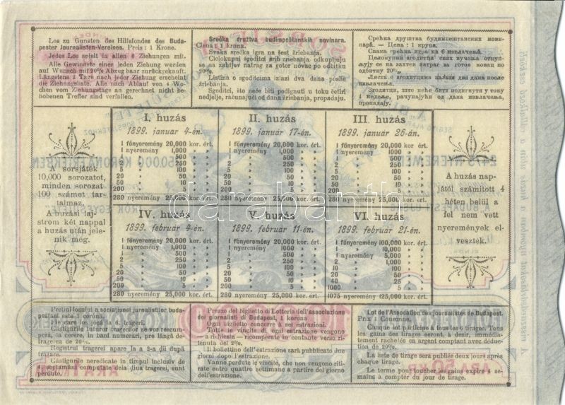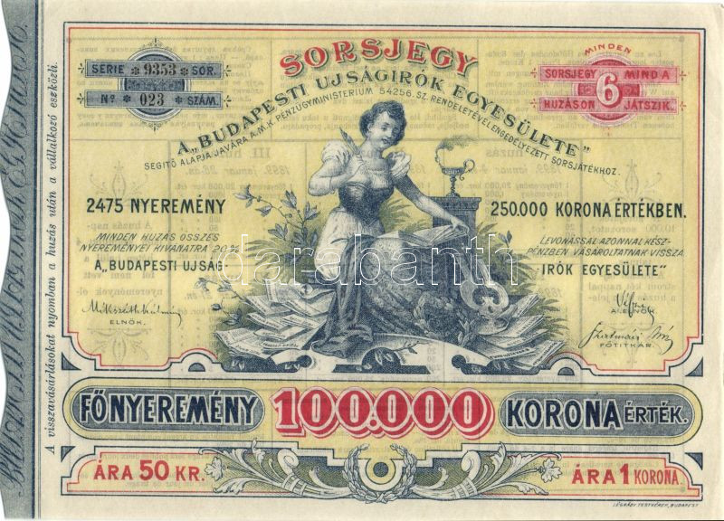 1898. "Budapesti Újságírók Egyesülete" sorsjegy T:I https://www.darabanth.com/de/82-Fernauktion/82.0/Numismatik/~244/1898-Budapesti-Ujsagirok-Egyesulete-sorsjegy-TI~II174029