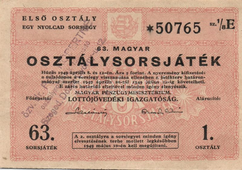 1949. "63.Magyar Osztálysorsjáték" lila "özv.Pap Róbertné osztálysorsj... https://www.darabanth.com/de/82-Fernauktion/82.0/Numismatik/~244/1949-63Magyar-Osztalysorsjatek-lila-ozvPap-Robertne-osztalysorsjatek-arusito-bC3~II174039