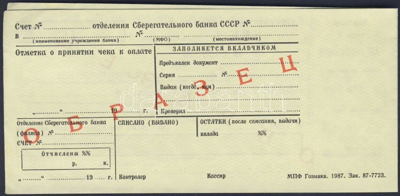 Beschreibung: Szovjetunió 1987. Csekkfüzet piros "Minta" fny-sal T:I-