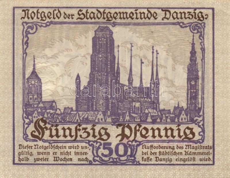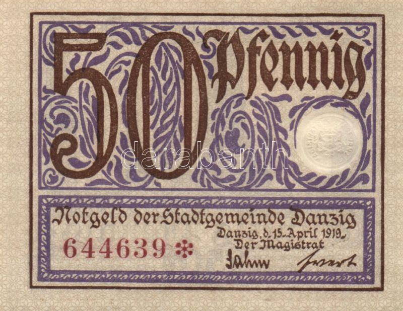 Danzig/Magisztrátus 1919. 50Pf vízjel cikkcakkvonal T:I https://www.darabanth.com/de/82-Fernauktion/82.0/Numismatik/~246/DanzigMagisztratus-1919-50Pf-vizjel-cikkcakkvonal-TI~II173717
