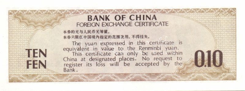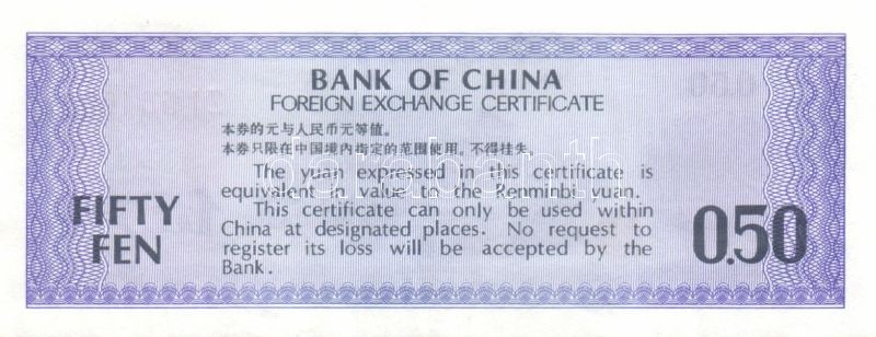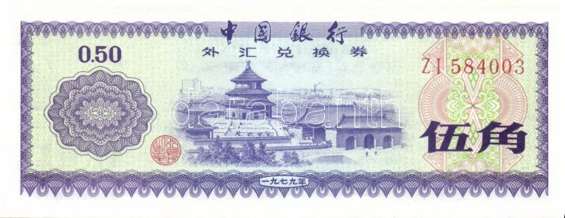 Beschreibung: Kína/Hainan Bank 1949. 2c, 5c T:I + Bank of China/Foreign Exchange Certificates 1979. 10F, 50F T:I,I- + 1db bón T:II