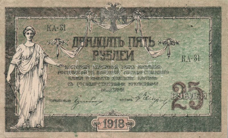 Orosz Polgárháború/ Dél-Oroszország 1918. 25R vízjellel T:II+ https://www.darabanth.com/de/82-Fernauktion/82.0/Numismatik/~247/Orosz-Polgarhaboru-Del-Oroszorszag-1918-25R-vizjellel-TIIplus~II173732