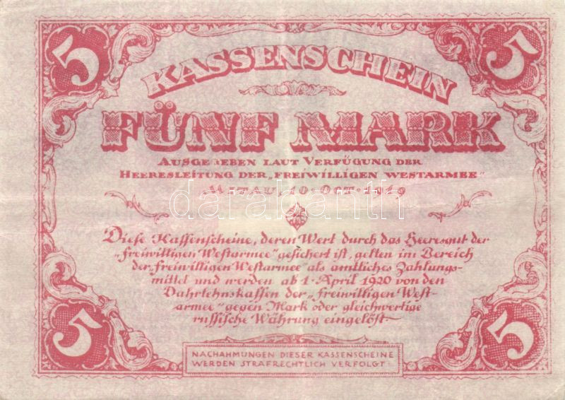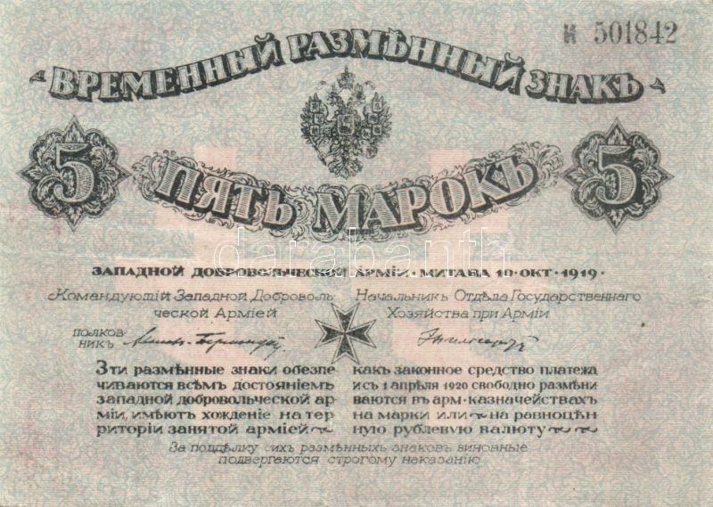 Beschreibung: Orosz Polgárháború/ Északnyugat Oroszország/ Önálló Nyugati Hadsereg Avalov-Bermondt ezredes parancsnoksága alatt 1919. 5M T:II
