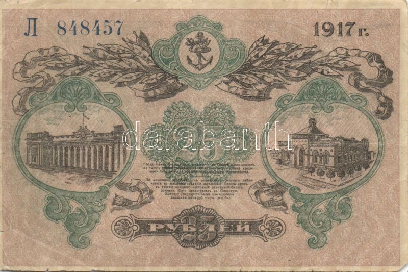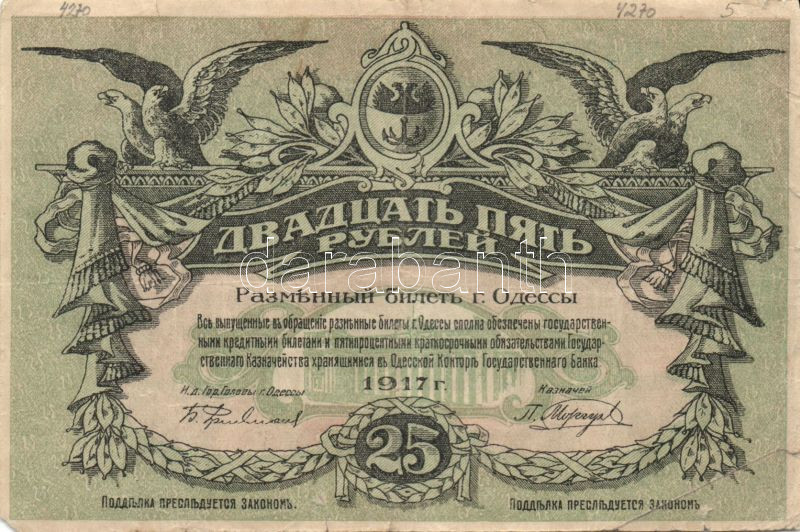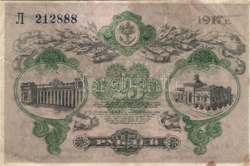 Orosz Polgárháború/ Ukrajna és Krím/ Ogyessza 1917. 25R vízjel nélkül ... https://www.darabanth.com/de/82-Fernauktion/82.0/Numismatik/~247/Orosz-Polgarhaboru-Ukrajna-es-Krim-Ogyessza-1917-25R-vizjel-nelkul-2klf-szinvarians-TI~II173739