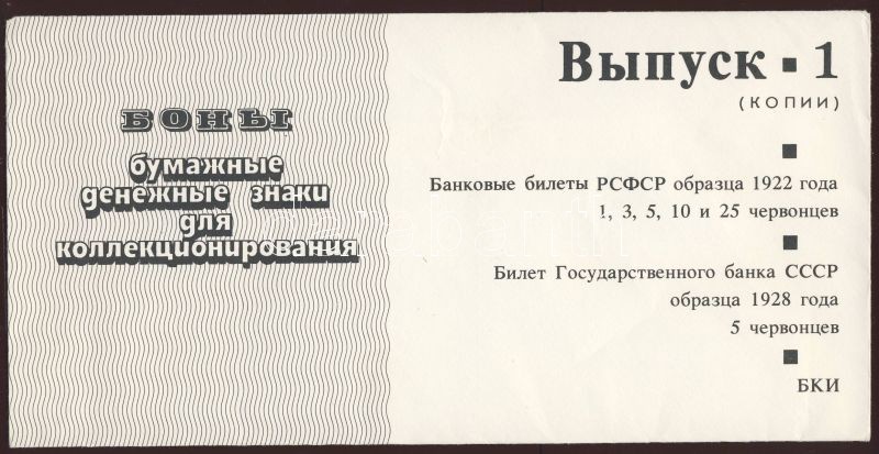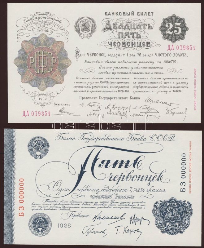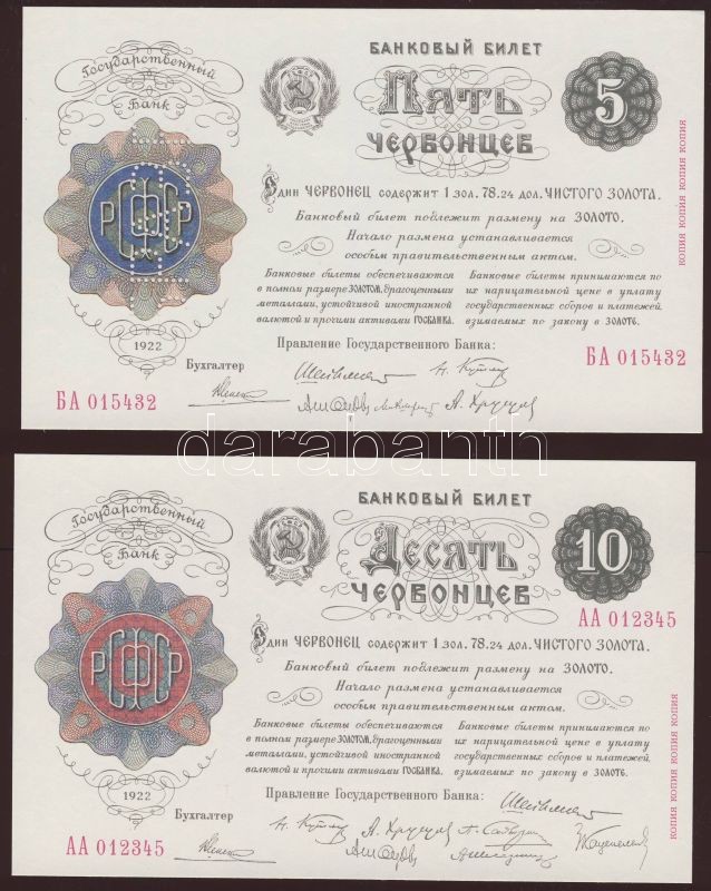 Oroszország/Sz.Sz.K. 1922. 1,3,5,10,25 Cservonyec + 1928. 5 Cservonyec 1994-ben készült (igen kevés példányszámban) hivatalos újnyomatai eredeti csomagolásban! T:I