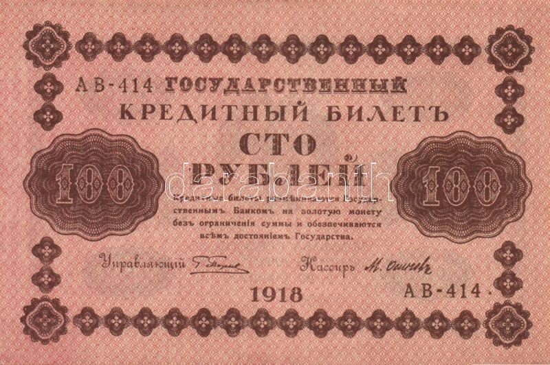Oroszország/Szocialista Szövetségi Szovjet Köztársaság 1918. 100R T:I- https://www.darabanth.com/de/82-Fernauktion/82.0/Numismatik/~247/OroszorszagSzocialista-Szovetsegi-Szovjet-Koztarsasag-1918-100R-TI-~II173747