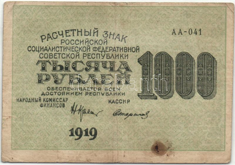 Beschreibung: Oroszország/Szocialista Szövetségi Szovjet Köztársaság 1919. (1920.) 1000R vízszintes "1000" vízjellel T:II/III