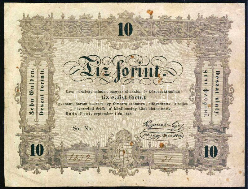 1848. 10Ft "Kossuth bankó" "alladalmi" nyomdahiba T:restaurált https://www.darabanth.com/de/82-Fernauktion/82.0/Numismatik/~248/1848-10Ft-Kossuth-banko-alladalmi-nyomdahiba-Trestauralt~II173275