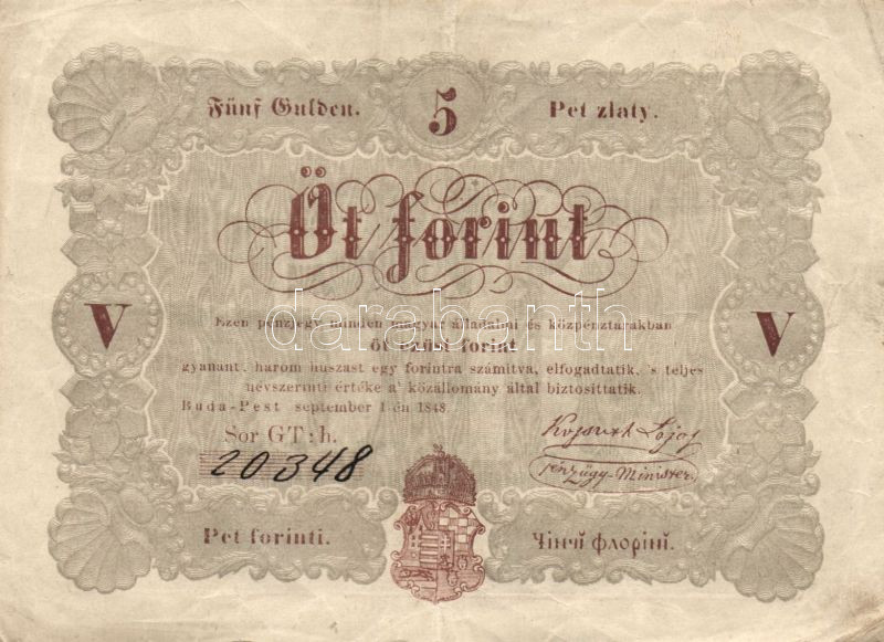 1848. 5Ft "Kossuth bankó" barna, "Buda-Pest" szó után nincs vessző T:I... https://www.darabanth.com/de/82-Fernauktion/82.0/Numismatik/~248/1848-5Ft-Kossuth-banko-barna-Buda-Pest-szo-utan-nincs-vesszo-TIIIIIplus~II172833