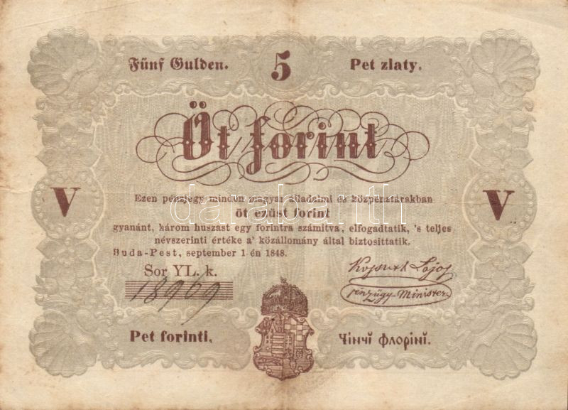 1848. 5Ft "Kossuth bankó" barna T:III+ https://www.darabanth.com/de/82-Fernauktion/82.0/Numismatik/~248/1848-5Ft-Kossuth-banko-barna-TIIIplus~II173062