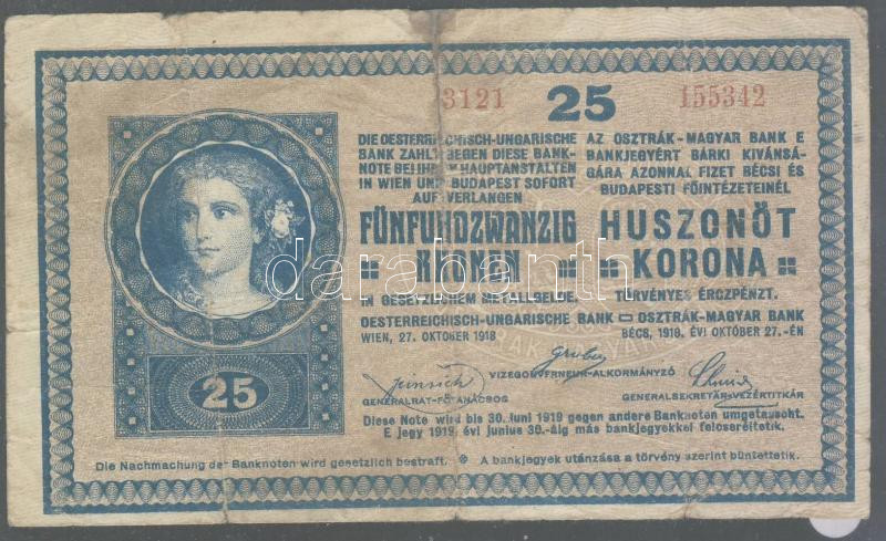 1918. 25K "hullámos" "3121" sorozatszám T:III-/IV https://www.darabanth.com/de/82-Fernauktion/82.0/Numismatik/~248/1918-25K-hullamos-3121-sorozatszam-TIII-IV~II173933
