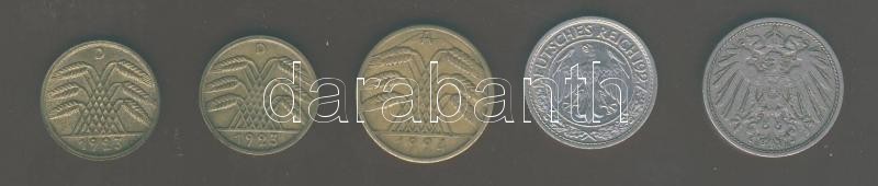 Beschreibung: Német Birodalom/Császárság 1896E 10Pf T:3+ + Német Birodalom/Weimari Köztársaság 1923D 5RentenPf T:3+ + 1923D 5RentenPf érdekes tévveret "Reich" szó E betűje jobb oldalán hosszú vonal a peremig! T:2/3+ + 1924A 10RentenPf érdekes tévveret a kalászokat az "A" betűvel két oldalról vonal köti őssze! T:2/3+ + 1927A 50Rpf T:2/3 Összesen 5db!