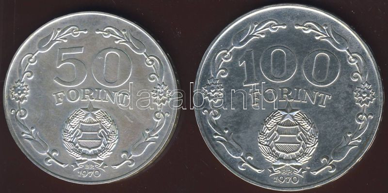 1970. 50Ft Ag + 100Ft Ag "Felszabadulás" pár T:BU https://www.darabanth.com/de/82-Fernauktion/82.0/Numismatik/~254/1970-50Ft-Ag-plus-100Ft-Ag-Felszabadulas-par-TBU~II174020