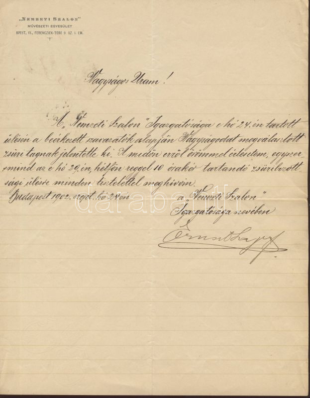 Beschreibung: 1902 Ernst Lajos aláírása Nemzeti Szalon levélpapírján