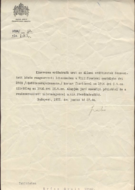 Beschreibung: 1922 Nagyatádi Szabó István földművelésügyi miniszter aláírása levélen