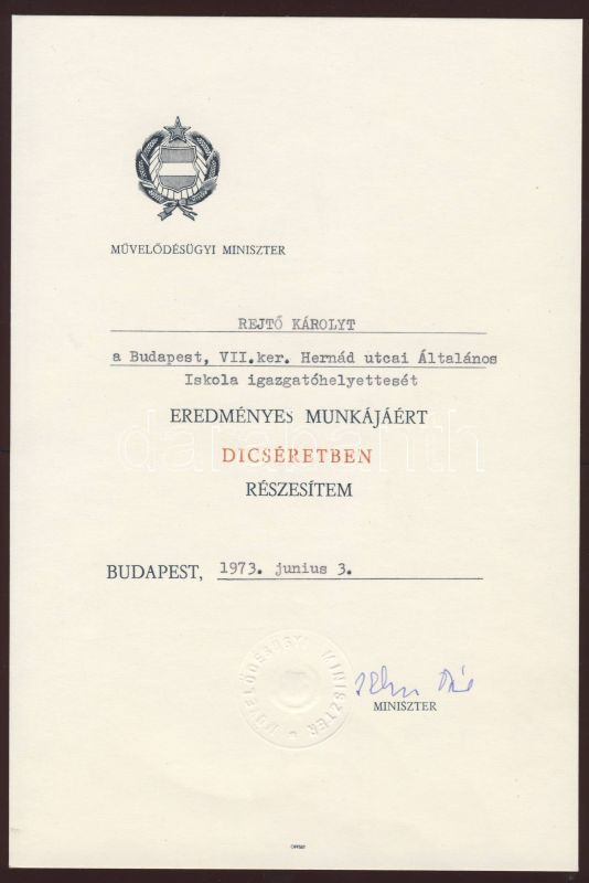 Beschreibung: 1973 lku Pál művelődésügyi miniszter aláírása levélen
