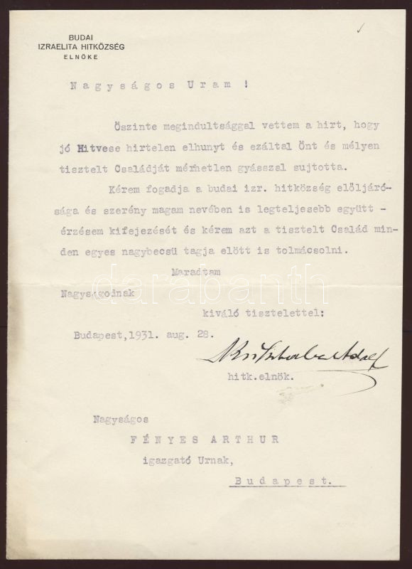 1931 Budai Izraelita Hitközség elnökének levele / Kriszhaber Adolt alá... https://www.darabanth.com/de/83-Fernauktion/83.0/Andere-Sammelgebiete/~5060/1931-Budai-Izraelita-Hitkozseg-elnokenek-levele-Kriszhaber-Adolt-alairasa~II176771