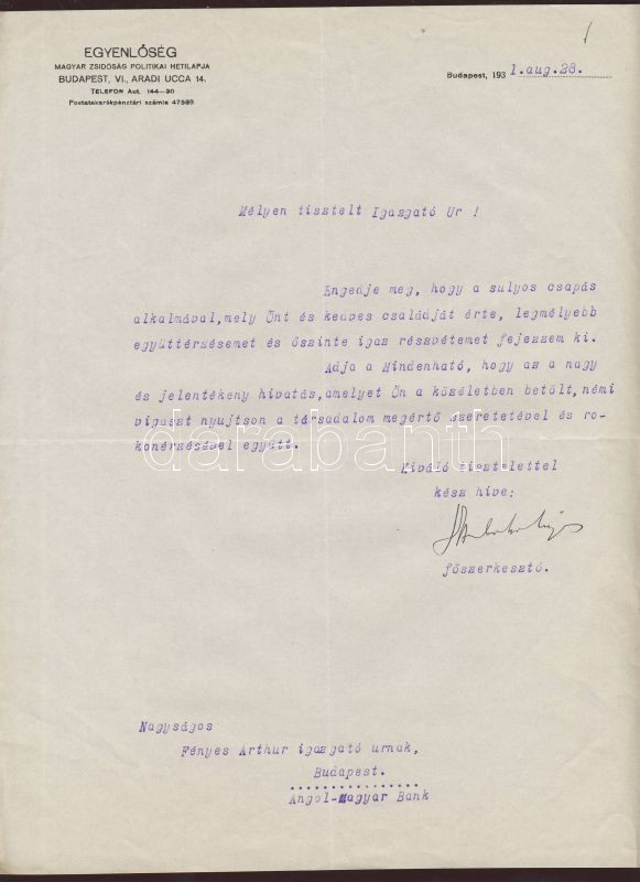 1931 Egyenlőség zsidó lap a főszerkesztő aláírásával https://www.darabanth.com/de/83-Fernauktion/83.0/Andere-Sammelgebiete/~5060/1931-Egyenloseg-zsido-lap-a-foszerkeszto-alairasaval~II176780