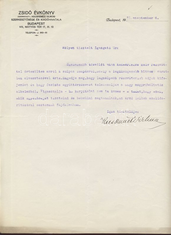 1931 Zsidó évkönyv Kecskeméti Mirtusz aláírása https://www.darabanth.com/de/83-Fernauktion/83.0/Andere-Sammelgebiete/~5060/1931-Zsido-evkonyv-Kecskemeti-Mirtusz-alairasa~II176775
