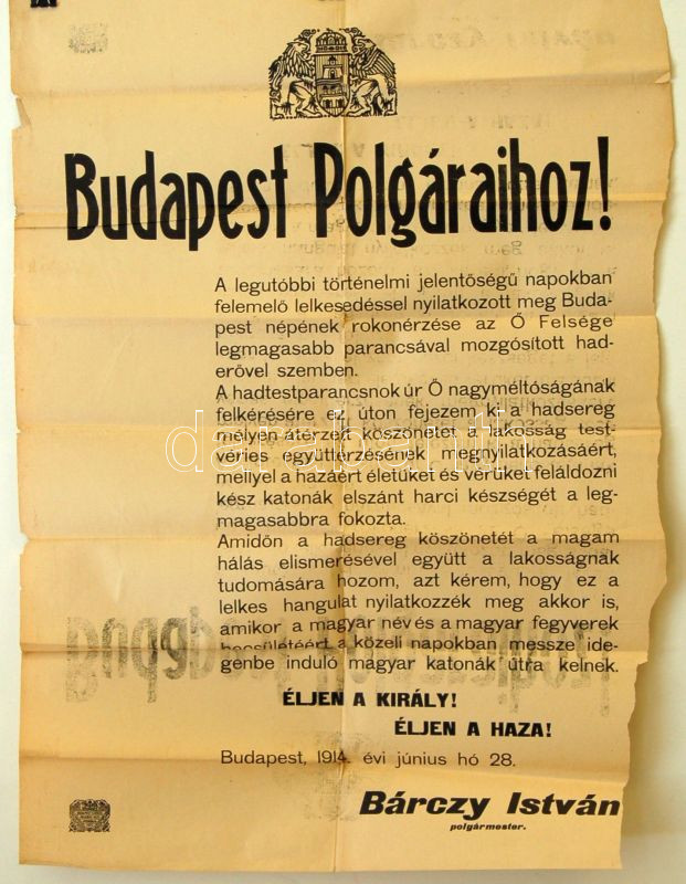 1914 június 28. Budapest főpolgármesterének hazafias lelkesítő plakátj... https://www.darabanth.com/de/83-Fernauktion/83.0/Andere-Sammelgebiete/~5064/1914-junius-28-Budapest-fopolgarmesterenek-hazafias-lelkesito-plakatja-a-hadrakelt-seregrol~II176939