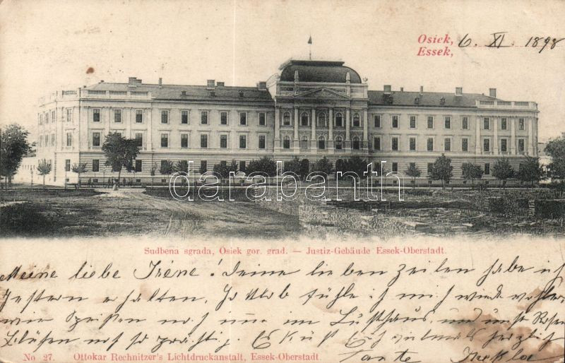 1898 Eszék Osijek Justice-building https://www.darabanth.com/de/83-Fernauktion/83.0/Ansichtskarten/~5057/1898-Eszek-Osijek-Justice-building~II176103