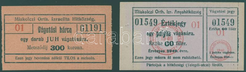 Beschreibung: Miskolc 1940. Zsidó vágási bárcák 2klf db T:I