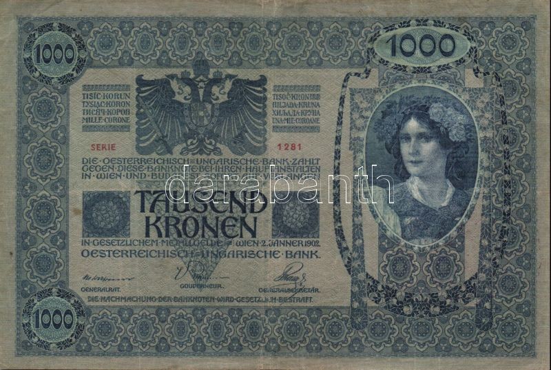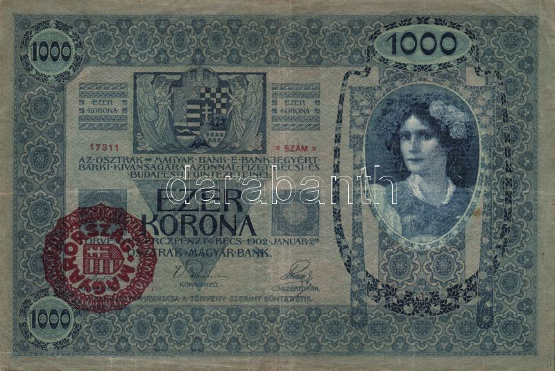 1902. 1000K piros "Magyarország" körbélyegzővel T:II/III https://www.darabanth.com/de/83-Fernauktion/83.0/Numismatik/~5080/1902-1000K-piros-Magyarorszag-korbelyegzovel-TIIIII~II176971