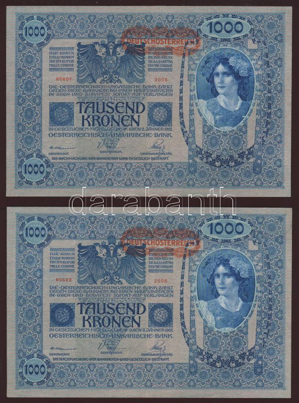 Beschreibung: 1902. 1000Kr mindkét oldal német nyelvű(Osztrák-Magyar Bank) piros "Deutschösterreich" fny-sal (2x) egymásutáni sorszámozássalT:I