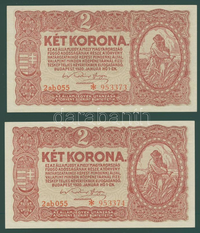 1920. 2K(2x) "*"-gal egymásutáni sorszámokkal T:I https://www.darabanth.com/de/83-Fernauktion/83.0/Numismatik/~5080/1920-2K2x-gal-egymasutani-sorszamokkal-TI~II175478