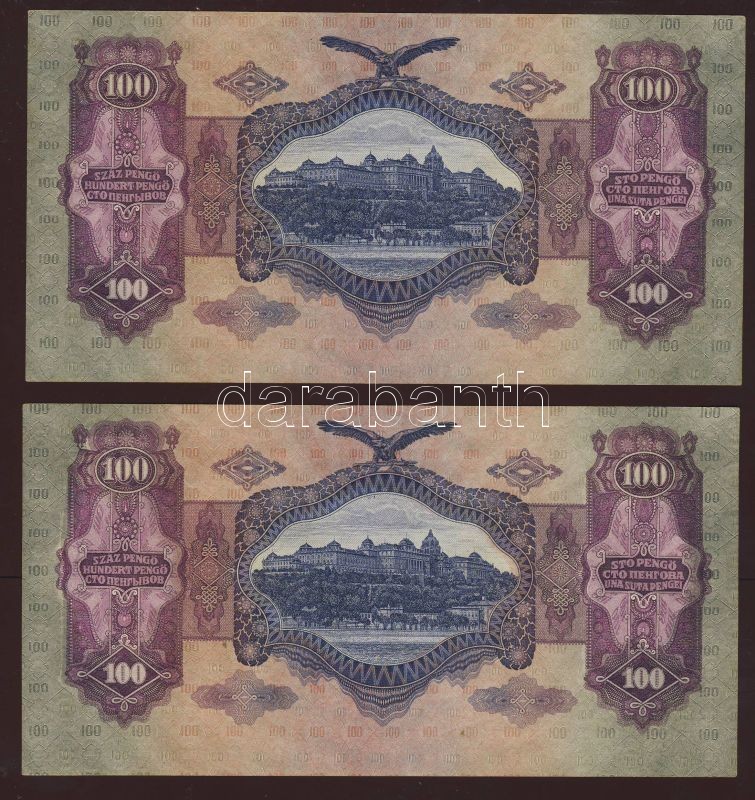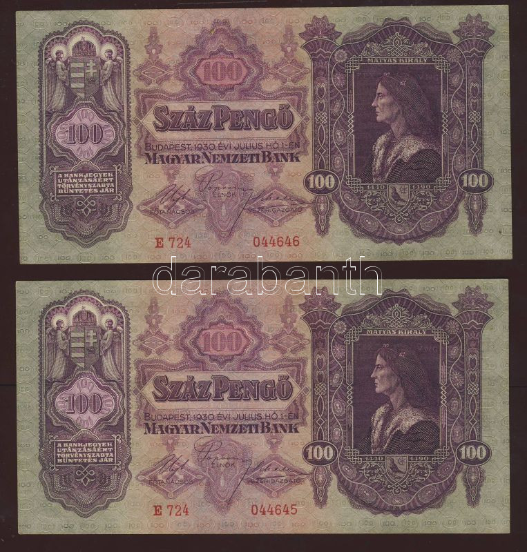 1930. 100P(2x) egymásutáni sorszámozással, sorozatszám utolsó betűje felfelé csúszva, az egyik hátlapi nyomatának bal oldalán jól látható alapnyomat és színhiányok! R! Ezenkívül mindkét hátlapi nyomat felfelé csúszva! T:I