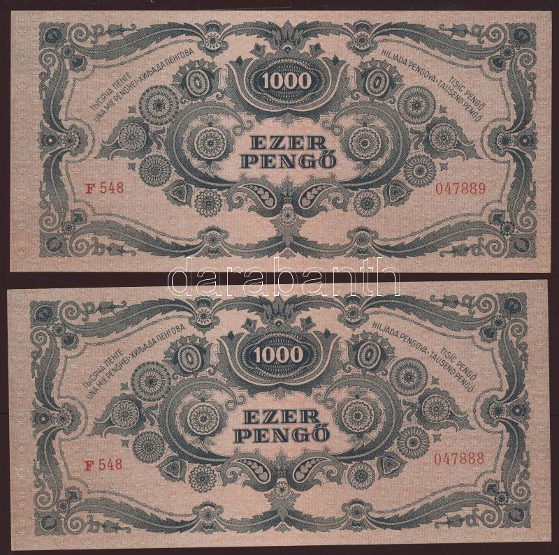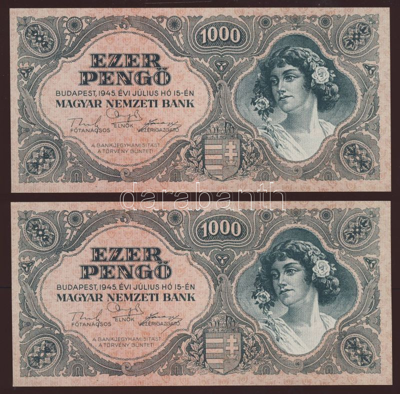 1945. 1000P(2x) egymásutáni sorszámokkal T:I https://www.darabanth.com/de/83-Fernauktion/83.0/Numismatik/~5080/1945-1000P2x-egymasutani-sorszamokkal-TI~II175484