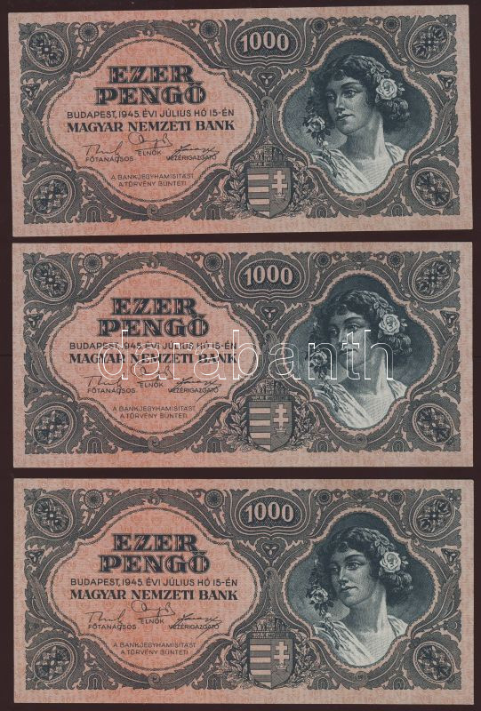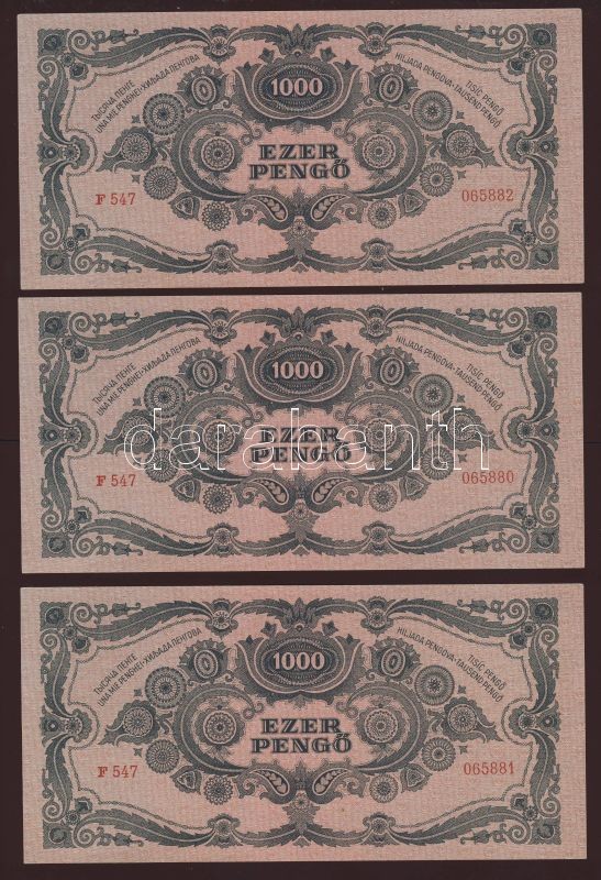 1945. 1000P(3x) egymásutáni sorszámokkal, erősebb rózsaszínes árnyalat... https://www.darabanth.com/de/83-Fernauktion/83.0/Numismatik/~5080/1945-1000P3x-egymasutani-sorszamokkal-erosebb-rozsaszines-arnyalatvarians-TI~II175486