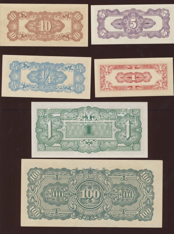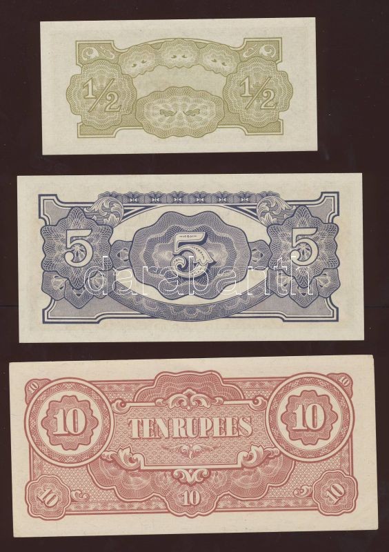 Beschreibung: Burma/japán megszállás 1942-1944. 1c, 5c,10c,1/4R,1/2R,1R,5R,10R,100R T:I Összesen 9klf db!
