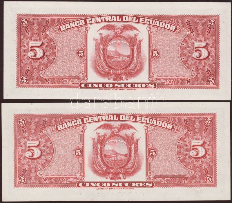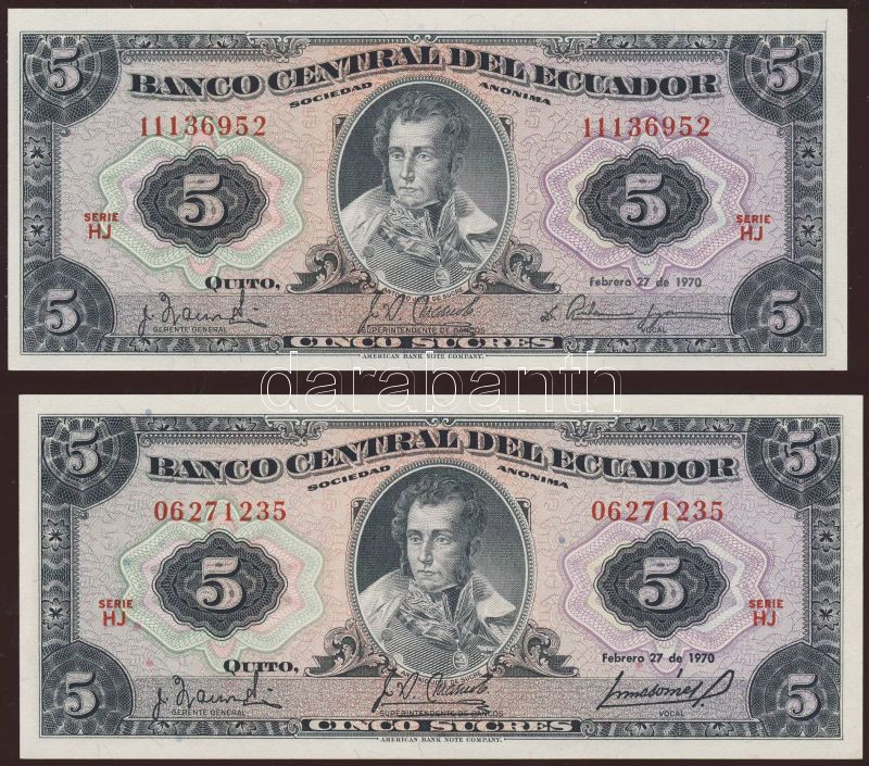 Ekvádor 1970.2.27. 5S (2x) 2klf aláírással T:I https://www.darabanth.com/de/83-Fernauktion/83.0/Numismatik/~5081/Ekvador-1970227-5S-2x-2klf-alairassal-TI~II174661
