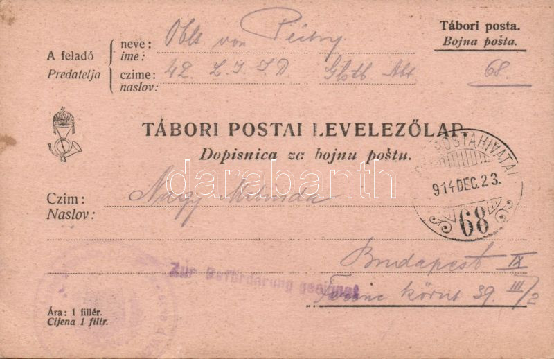 1914 Péchy Kálmán leendő altábornagy tábori levelezőlapja https://www.darabanth.com/de/84-Fernauktion/84.0/Andere-Sammelgebiete/~309/1914-Pechy-Kalman-leendo-altabornagy-tabori-levelezolapja~II178545