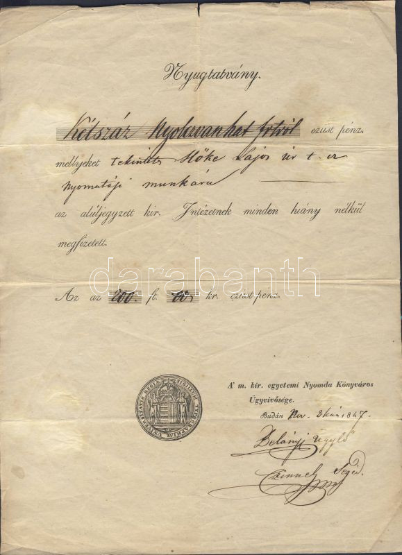 1847 Egyetemi Nyomda nyugta https://www.darabanth.com/de/84-Fernauktion/84.0/Andere-Sammelgebiete/~312/1847-Egyetemi-Nyomda-nyugta~II178890