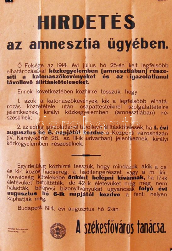 1914 Katonaszökevényeknek amnesztiát hirdető hirdetmény 45x60cm https://www.darabanth.com/de/84-Fernauktion/84.0/Andere-Sammelgebiete/~314/1914-Katonaszokevenyeknek-amnesztiat-hirdeto-hirdetmeny-45x60cm~II177869