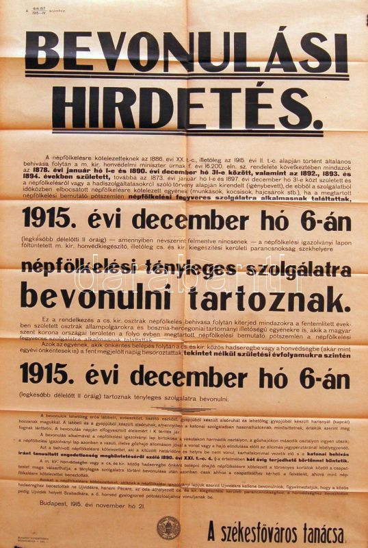 1915 Bevonulásra felhívó hirdetmény 60x45cm https://www.darabanth.com/de/84-Fernauktion/84.0/Andere-Sammelgebiete/~314/1915-Bevonulasra-felhivo-hirdetmeny-60x45cm~II177518