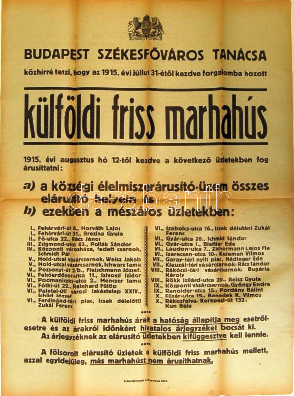 1915 Hirdetmény külföldi friss marhahaús árusításáról 50x65cm https://www.darabanth.com/de/84-Fernauktion/84.0/Andere-Sammelgebiete/~314/1915-Hirdetmeny-kulfoldi-friss-marhahaus-arusitasarol-50x65cm~II177855