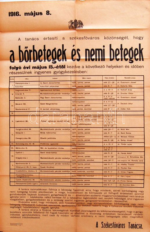 Beschreibung: 1916 Bőr és nemibetegek számára hirdetett ingyenes rendelésekről szóló hirdetmény 60x90cm