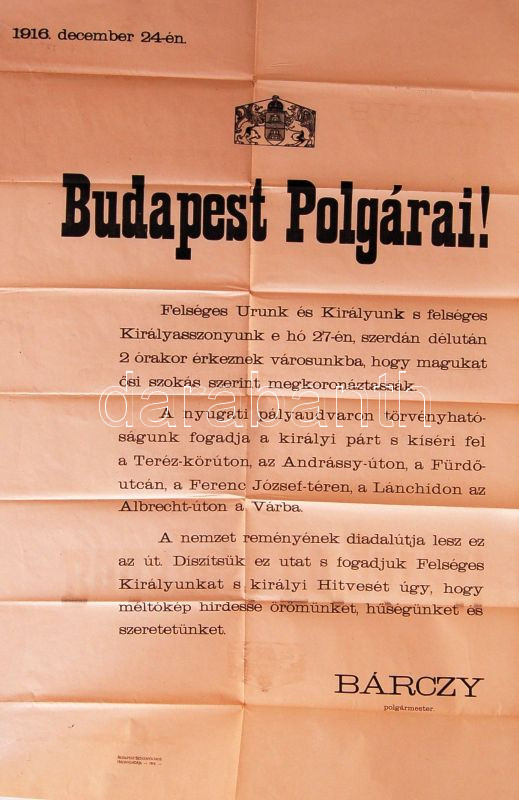 1916 Károly király koronázásával kapcsolatos fővárosi hirdetmény 60x95... https://www.darabanth.com/de/84-Fernauktion/84.0/Andere-Sammelgebiete/~314/1916-Karoly-kiraly-koronazasaval-kapcsolatos-fovarosi-hirdetmeny-60x95cm~II177873