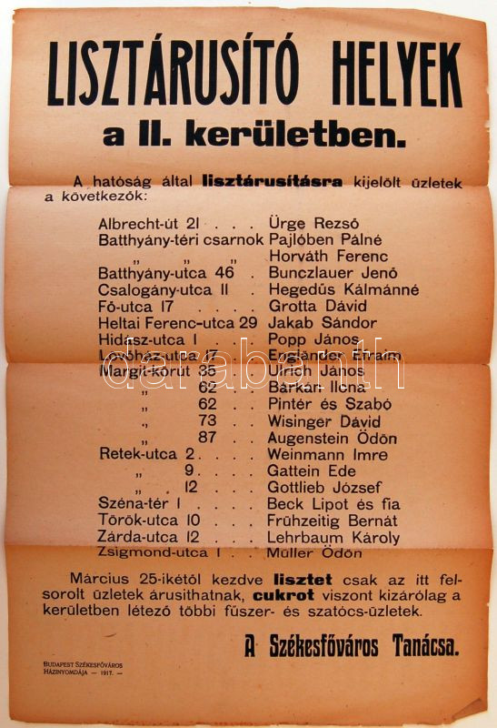 1917 Hirdetmény lisztárusító helyekről a II. kerületben 47x32cm https://www.darabanth.com/de/84-Fernauktion/84.0/Andere-Sammelgebiete/~314/1917-Hirdetmeny-lisztarusito-helyekrol-a-II-keruletben-47x32cm~II177504