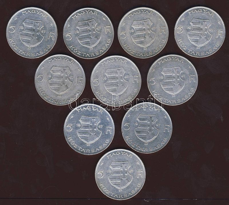1947. 5Ft Ag (10x) "Kossuth" T:2,2/3 https://www.darabanth.com/de/84-Fernauktion/84.0/Numismatik/~322/1947-5Ft-Ag-10x-Kossuth-T2-23~II179220