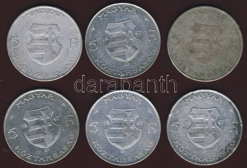 1947. 5Ft Ag (6x) "Kossuth" T:2,2/3 https://www.darabanth.com/de/84-Fernauktion/84.0/Numismatik/~322/1947-5Ft-Ag-6x-Kossuth-T2-23~II179572