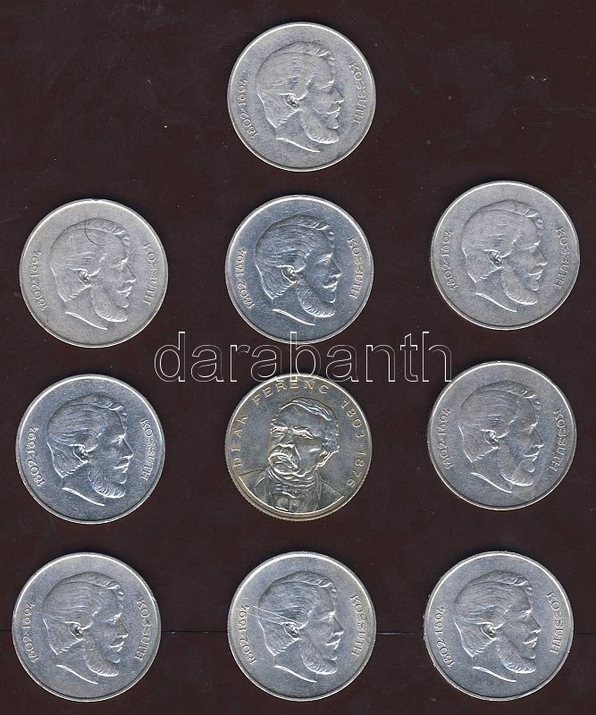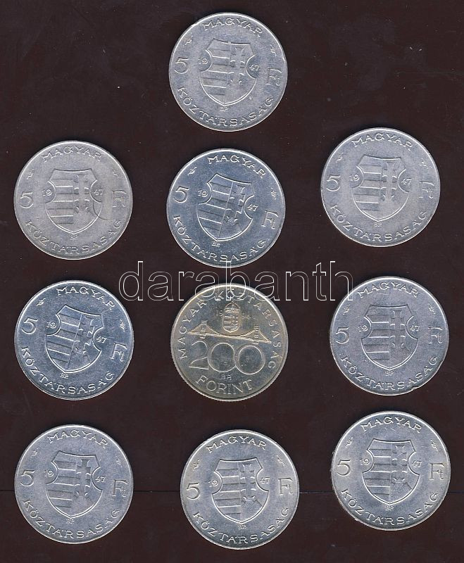 1947. 5Ft Ag (9x) "Kossuth" + 1994. 200Ft Ag (1x) "Deák" T:2,2/3 https://www.darabanth.com/de/84-Fernauktion/84.0/Numismatik/~322/1947-5Ft-Ag-9x-Kossuth-plus-1994-200Ft-Ag-1x-Deak-T2-23~II179211