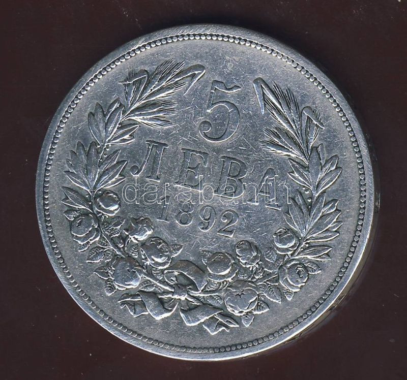 Bulgária 1892. K.B. (magyar verdejel) 5L Ag T:3+/3 https://www.darabanth.com/de/84-Fernauktion/84.0/Numismatik/~322/Bulgaria-1892-KB-magyar-verdejel-5L-Ag-T3plus3~II179759