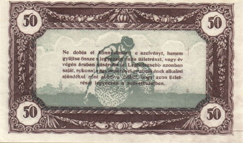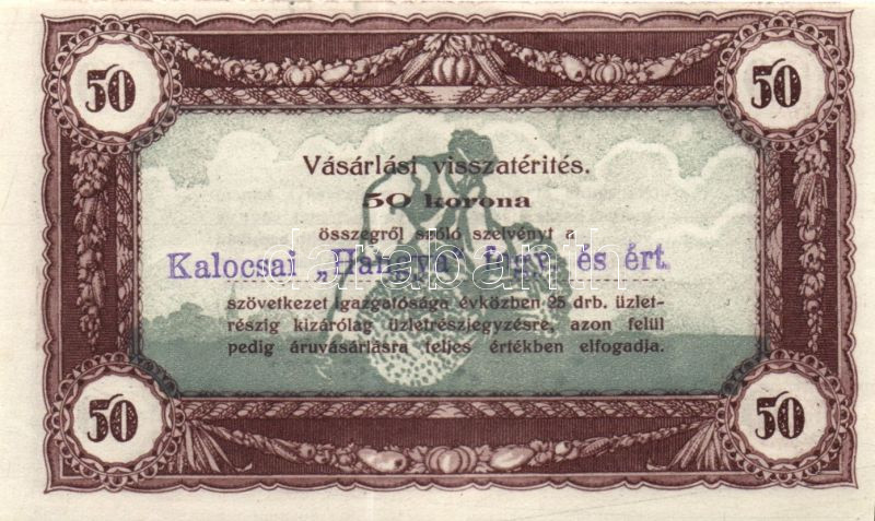 Beschreibung: 1920-as évek eleje 50K vásárlási visszatérítés lila "Kalocsai Hangya fogy. és ért." bélyegzővel, hátoldalán barna nyomdai csík! T:I