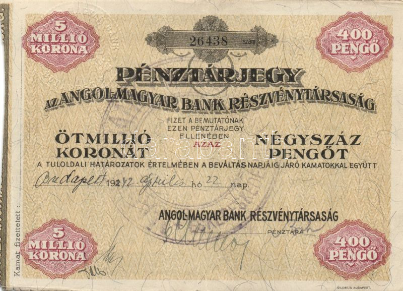 1942. Az Angol-Magyar Bank Részvénytársaság pénztárjegye 400P régi, 19... https://www.darabanth.com/de/84-Fernauktion/84.0/Numismatik/~325/1942-Az-Angol-Magyar-Bank-Reszvenytarsasag-penztarjegye-400P-regi-1923-bol-visszamaradt-db~II179849