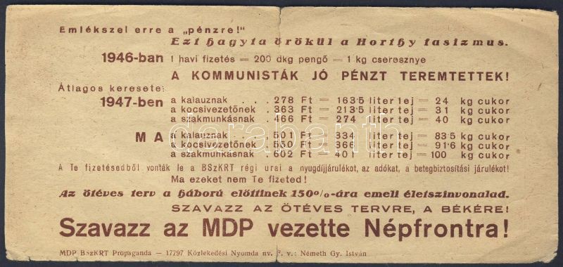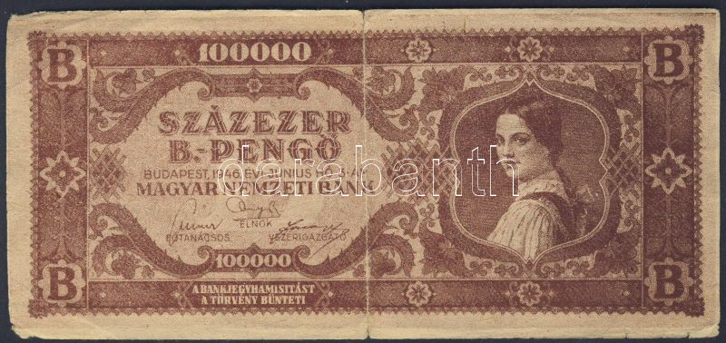 1946. 100000B.-pengő imitáció hátoldali kommunista propagandaszöveggel... https://www.darabanth.com/de/84-Fernauktion/84.0/Numismatik/~325/1946-100000B-pengo-imitacio-hatoldali-kommunista-propagandaszoveggel-R-TIIIIV~II179483